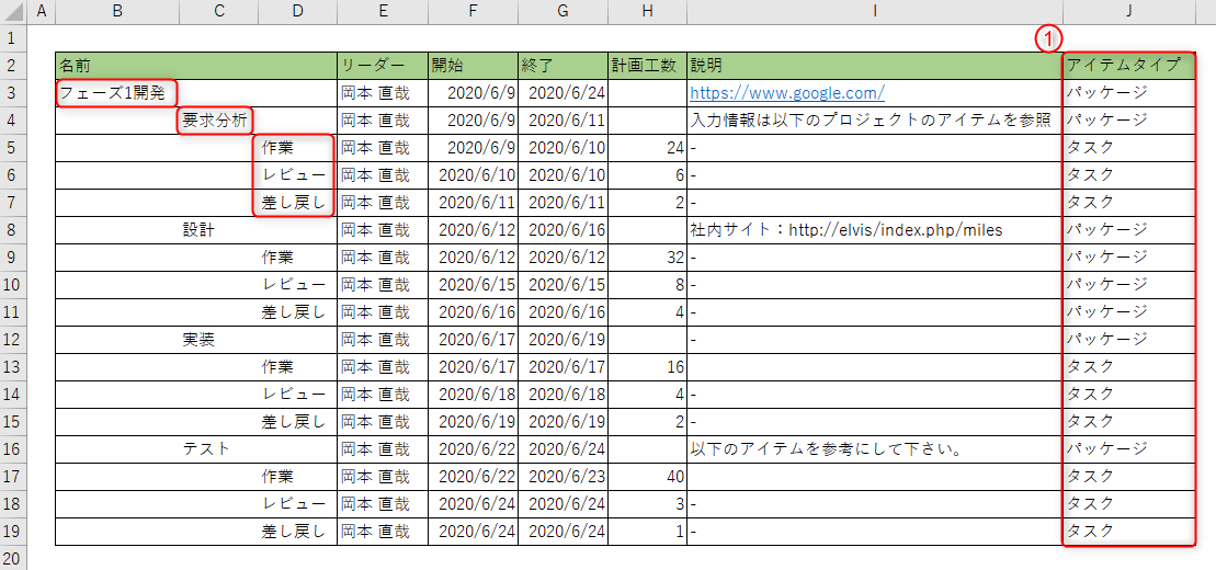 アイテムタイプの指定方法表の末尾に「アイテムタイプ」を定義する列を付け加えると、TimeTracker NX に張り付けた時に指定できます。
