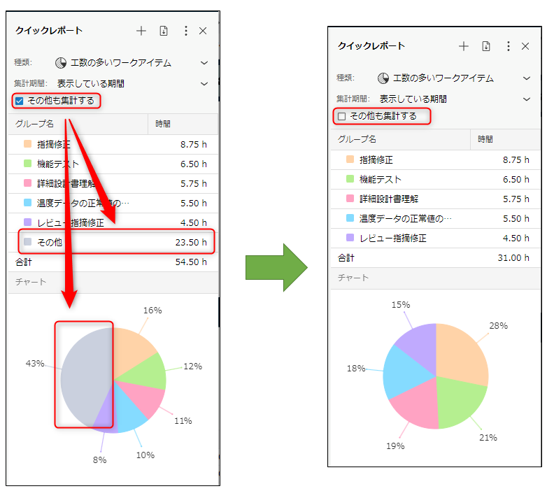 それぞれのレポートでは、工数の多い上位5項目とそれ以外の工数をまとめた「その他」の項目で工数を表示します。