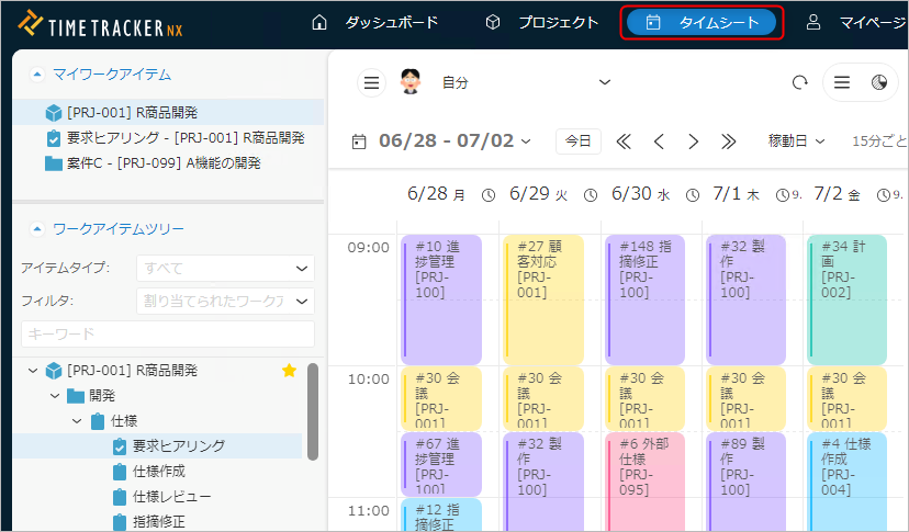 タイムシートを表示するには、TimeTracker NXのグローバルナビで「タイムシート」をクリックします。