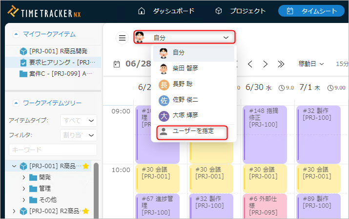 タイムシートでは、自分以外のユーザーの実績工数を表示することもできます。