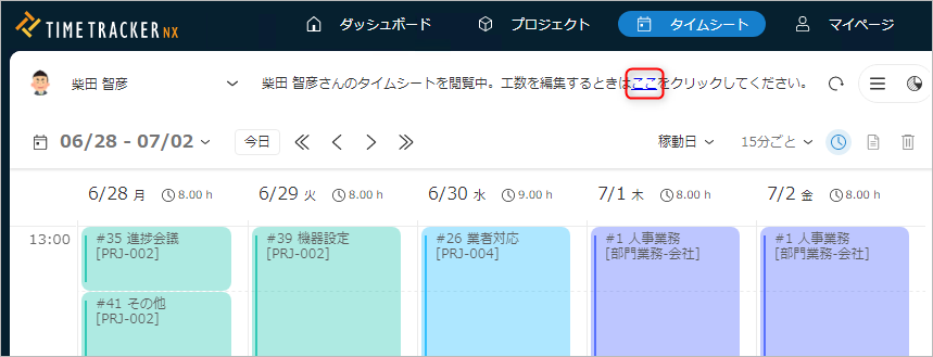 現在誰のタイムシートを表示しているかは、画面の左上に表示される名前で確認できます。