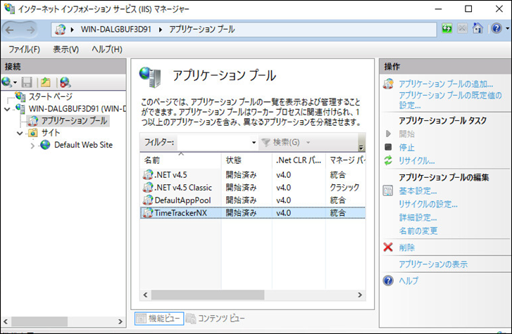 「アプリケーションプール」の一覧から、TimeTracker NXで追加したアプリケーションプールを選択する。
