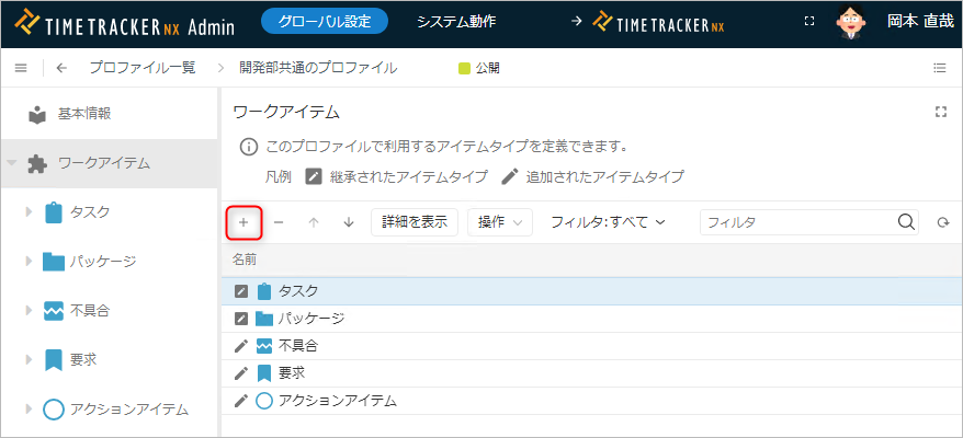 3. 左側のメニューから対象のアイテムタイプ(タスクやパッケージ)を選択する。