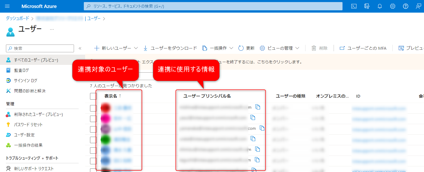 「ユーザープリンシパル名」はMicrosoft Azure ADの以下の画面で表示された項目です。