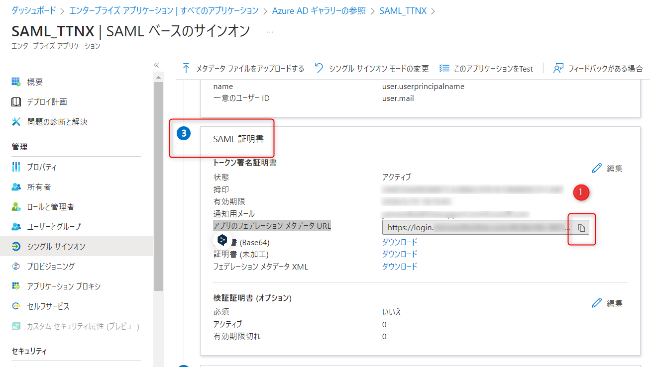 17. 遷移後の画面で「③ SAML証明書」の 「アプリのフェデレーション メタデータ URL」をコピーしてください。