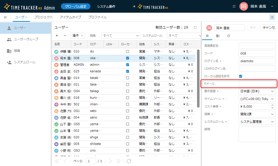 • 「Eメール」が空欄で「ローカル認証を許可」をチェックしていないユーザーはログインできなくなります。