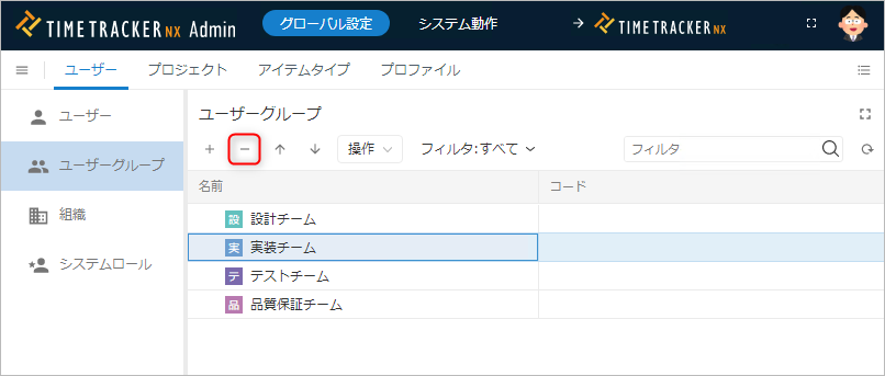 2. ユーザーグループ一覧の上部にある「-」アイコンをクリックする。