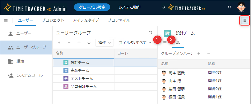 TimeTracker NXを利用するユーザーをユーザーグループとしてグループ化することができます。