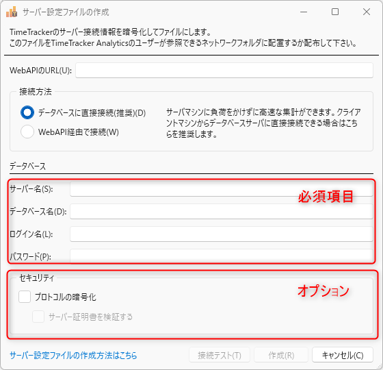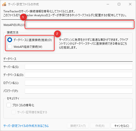 サーバー設定ファイルの作成には、TimeTracker NX のDBにアクセスするための情報が必要になります。