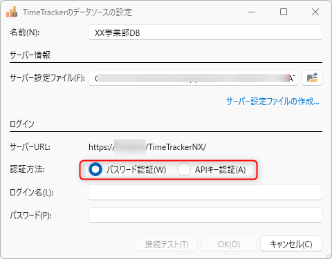 • 「パスワード認証」の場合:対象の TimeTracker NX にログインする際のログイン名、パスワードを入力してください