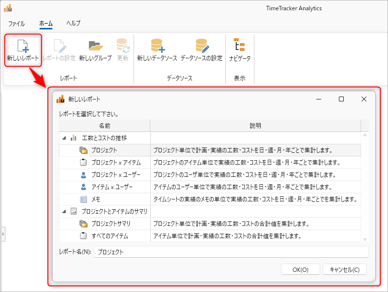 2. 対象レポートを選択してレポート名を入力し、「OK」ボタンをクリックしてください。