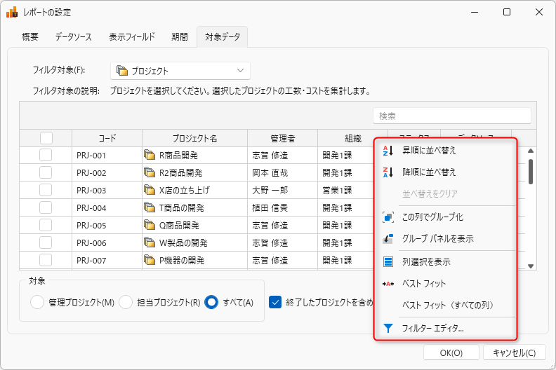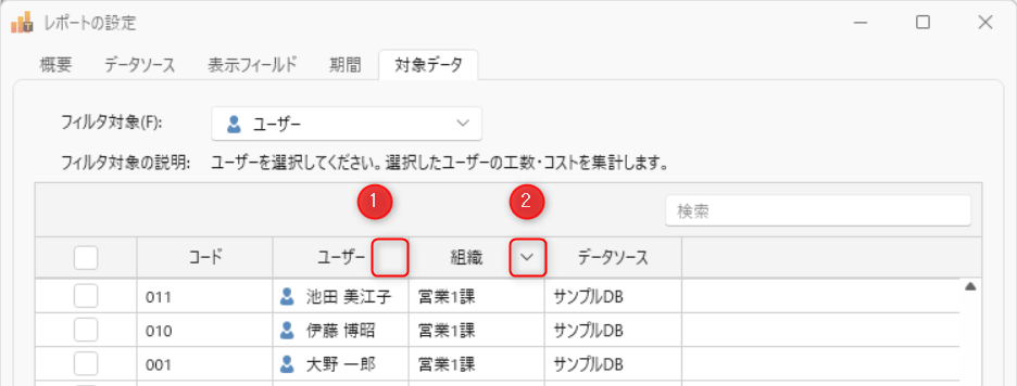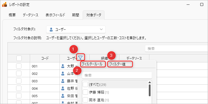 対象データの絞り込みは、次のリンクを参照ください。: 「対象データの選択