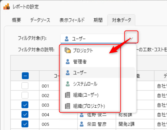 フィルタ対象を選択すると対象のデータを表示しますので、チェックしてください。
