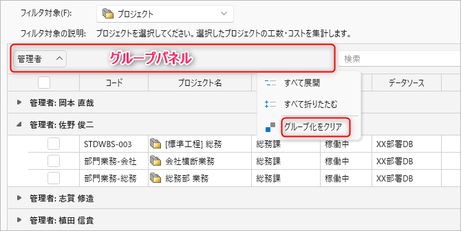 一覧表示されているデータをグループ化して整理します。