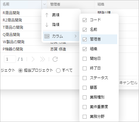 「プロジェクトの選択」ダイアログでは、各列の表示、非表示の状態を切り替えることができます。