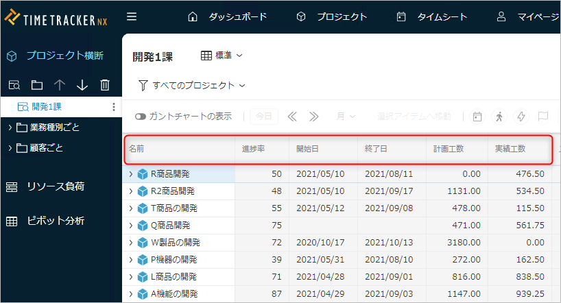 プロジェクト横断では、ガントチャート上に複数のプロジェクトを並べて表示し、進捗状況をまとめて確認することができます。