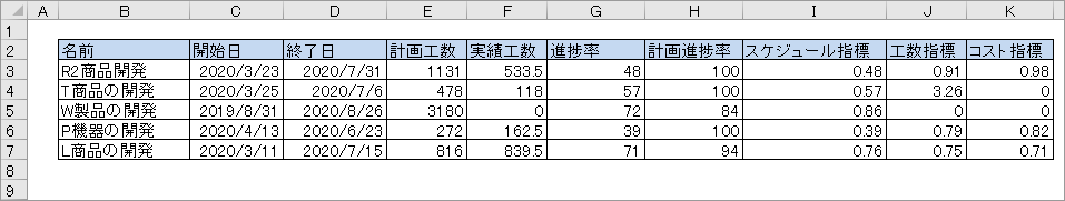 既定ではプロジェクトカテゴリの各列は非表示になっています。