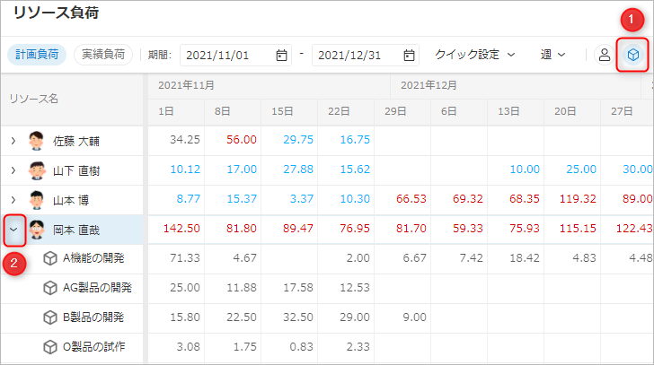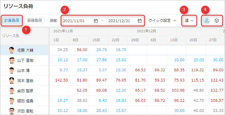 • 計画の負荷は、その人がリソースとして割り当てられた末端のタスクごとに、