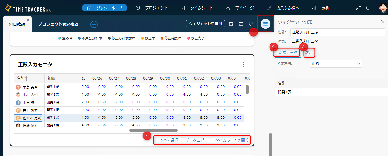 以下の方法で工数入力モニタウィジェットに表示する内容を設定します。