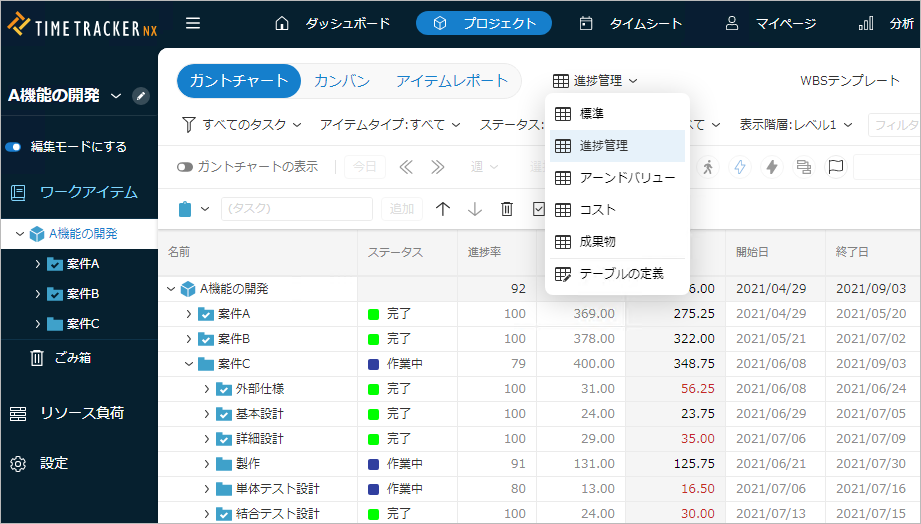 1. TimeTracker NXのプロジェクト画面で進捗管理用のガントテーブルを表示します。