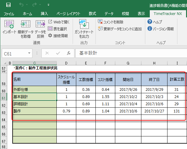 Excelにインポートして進捗報告書を作成します。