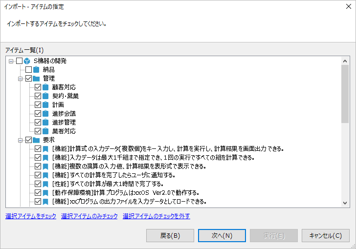 1. 「アイテム一覧」でインポート対象とするワークアイテムにチェックを入れて、「次へ」をクリックします。