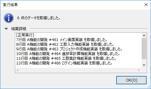 6. 表示される「実行結果」ダイアログで「OK」をクリックして、インポートが完了します。