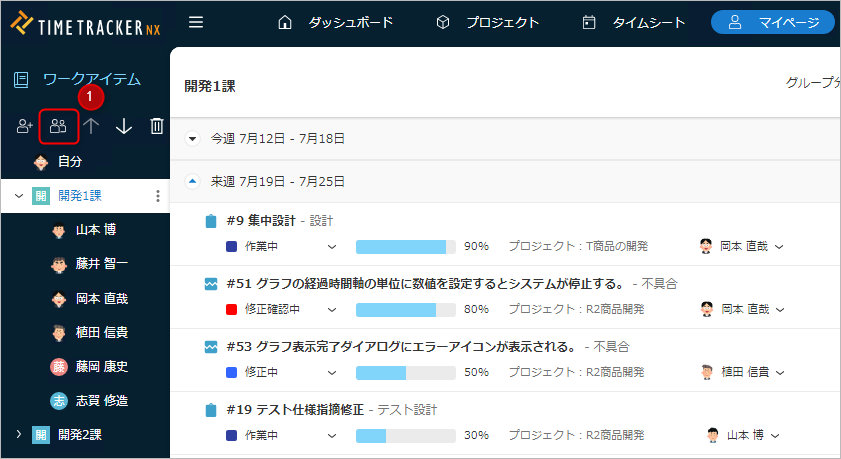 また、グループを選択するだけで、そのグループ全員のワークアイテムを確認することができます。