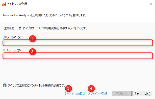 ツールの「ライセンス登録」画面で以下の項目を入力し、「登録」ボタンをクリックしてください。