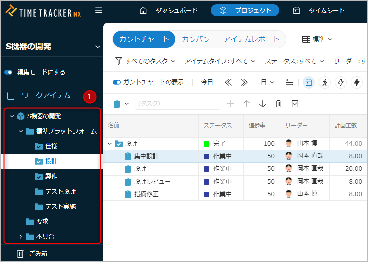 フォルダツリーで対象のフォルダを選択することで、表示するWBSを絞り込むことができます。