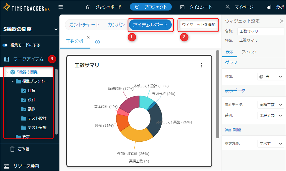 アイテムレポートは、プロジェクトの任意の範囲に対して進捗状況や工数の状況などを、簡単に分析する機能です。