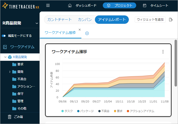 アイテムレポートはプロジェクト画面から表示を切り替えることで利用できます。