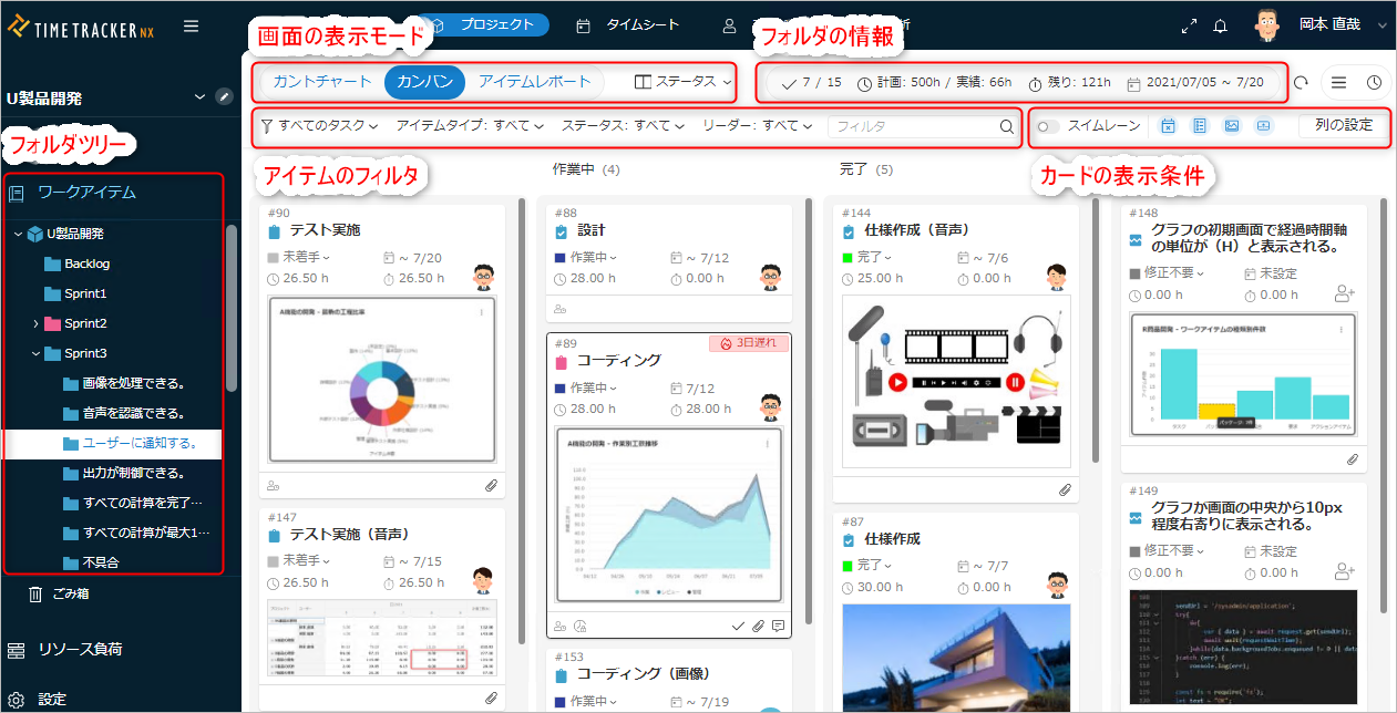 ワークアイテム画面で作成したアイテムをカンバンのビューで表示できます。