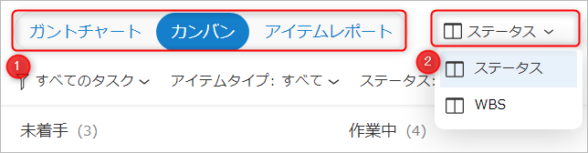 • ①アイテム数:画面に表示しているアイテム数(完了アイテム数 / 全アイテム数)
