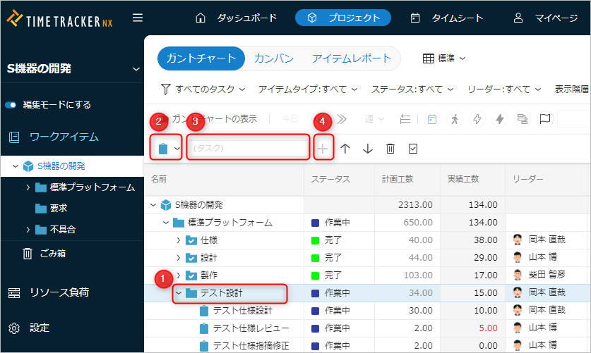 TimeTracker NX では、1つ1つの仕事を「ワークアイテム」で区切り、WBS構造で表現しています。