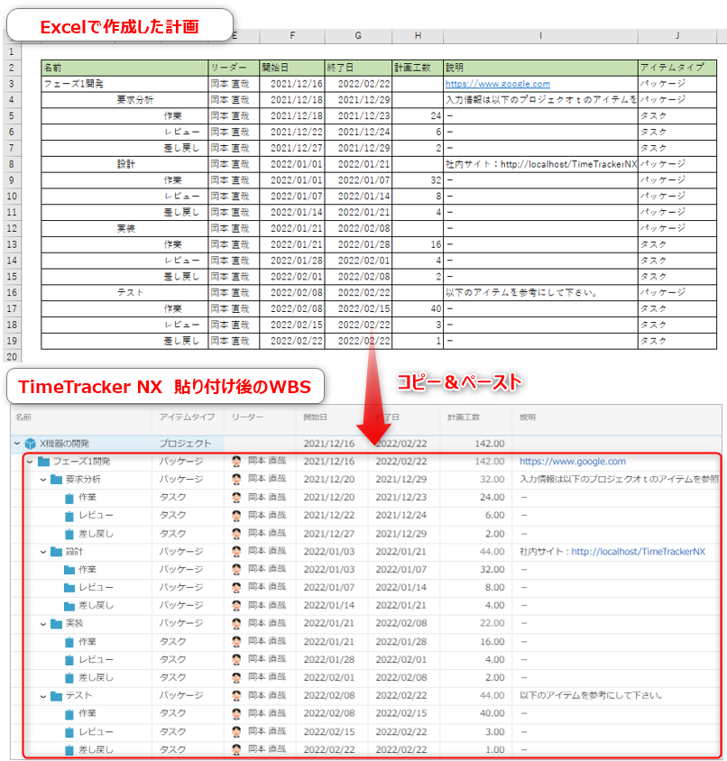 • Excel に各アイテムの計画を記載しておけば、TimeTracker NX のワークアイテムにまとめて反映できます。