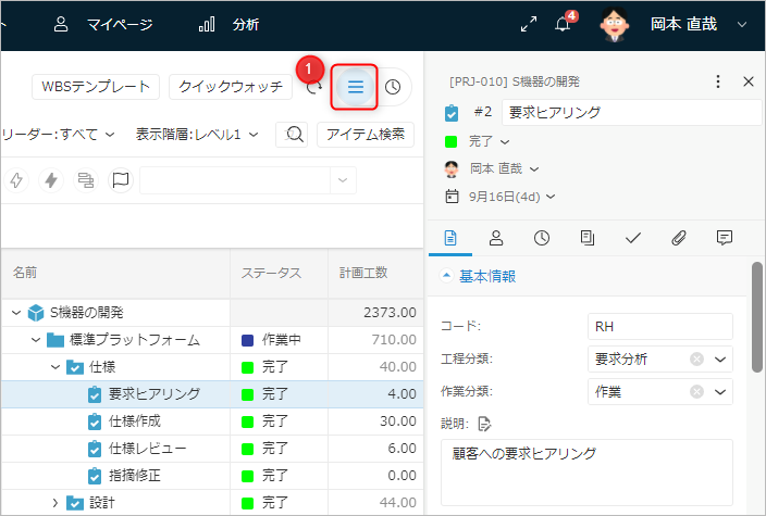 プロジェクト画面のアイテムプロパティでは、ワークアイテムの詳細情報を表示し、更新することができます。