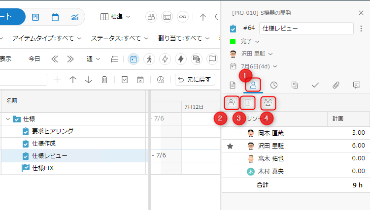 ワークアイテムにリソース(担当者)の追加や削除をすることができます。