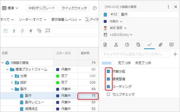 • チェックアイテムを完了にすると、進捗率に自動で反映され、進捗管理に利用することができます。