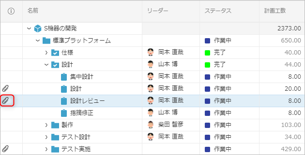 添付ファイルがあるワークアイテムはガントテーブル左端のInfo欄に記号が付きます。