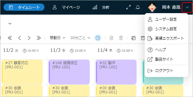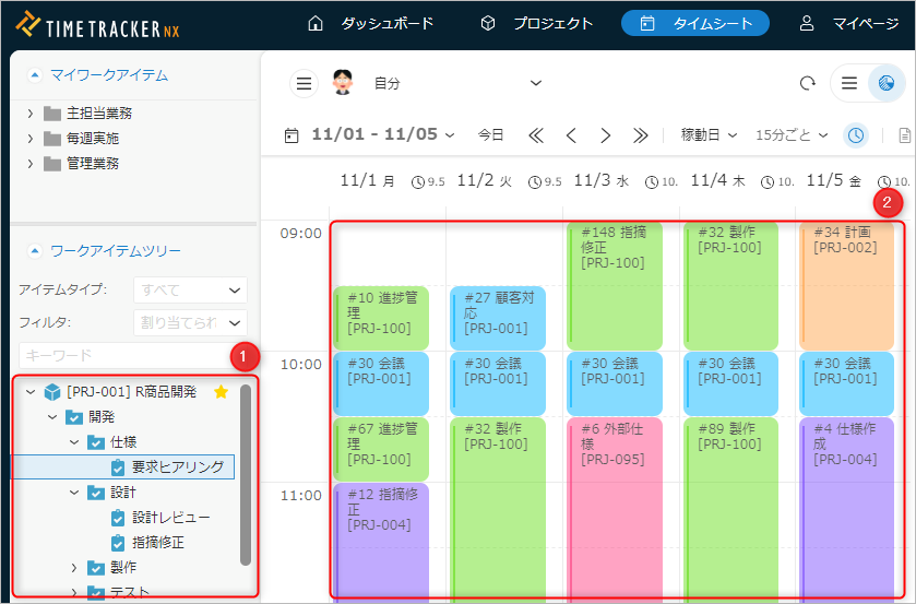 入力した実績は、タイムシート上でプロジェクトごとに色分けして表示することができます。