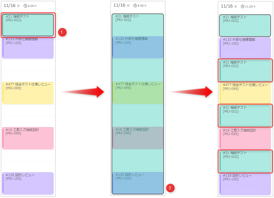 • 実績工数を移動する :対象とする実績工数を選択し、移動先の時間帯にドラッグ&ドロップする。