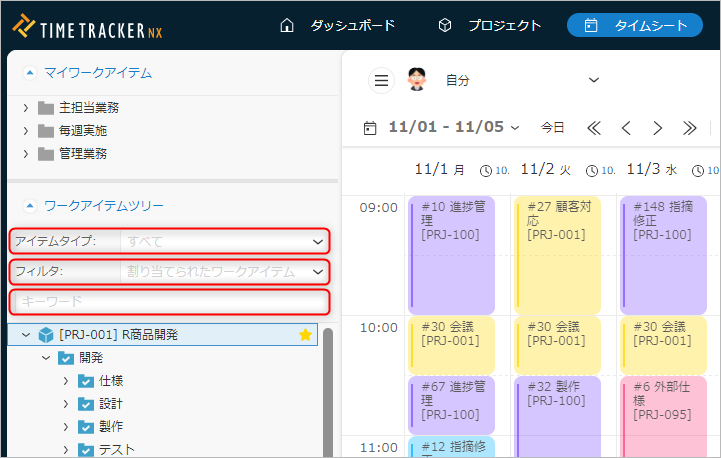 フィルタすることによりアイテムを探す手間が軽減され、工数入力の操作が簡単になります。