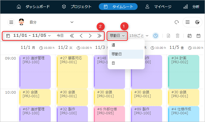 タイムシートに表示する粒度(日、稼働日、週)を切り替えることができます。