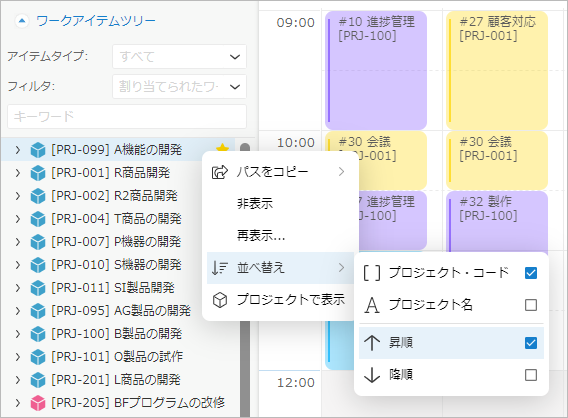 • プロジェクトコードもしくはプロジェクト名で、昇順か降順を設定できます。