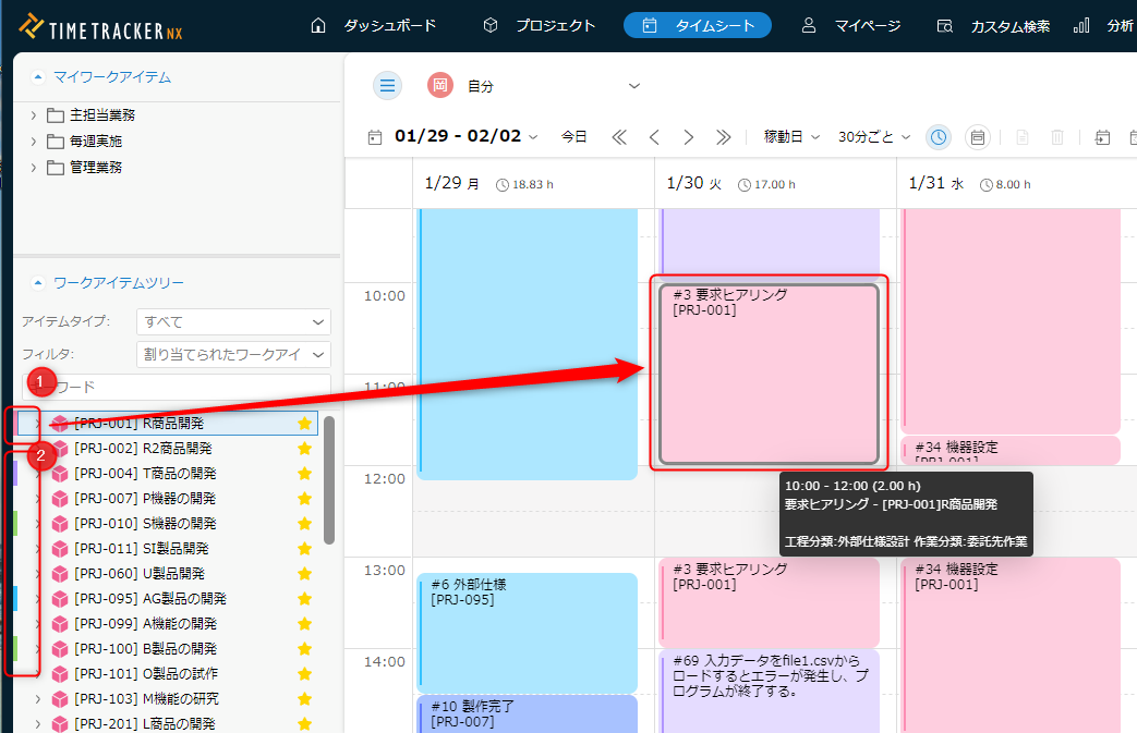 2. 選択したアイテムを、「工数入力ペイン」の該当する時間帯にドラッグ&ドロップする。