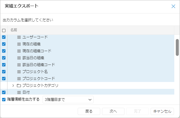 出力する場合はチェックボックスをチェックし、出力する階層を選択してください。