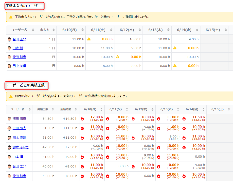 工数入力忘れ、負荷が高いユーザーをお知らせ