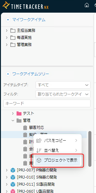 • プロジェクト管理画面を別タブで開く。 下図のように、アイテムを右クリックしてプロジェクトを開くことができます。