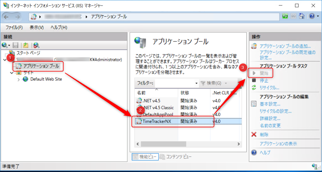 TimeTrackerNX の「状態列」が「開始済み」になっていない状態の場合、IISが停止しています。